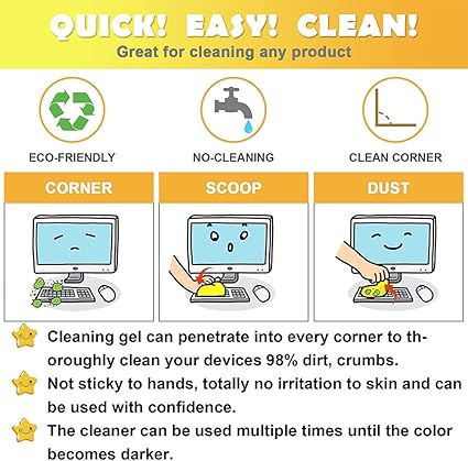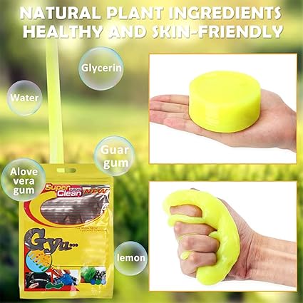 Gel de limpieza para coches El gel de limpieza para coches es perfecto para limpiar las esquinas y los ángulos de tu cocheEste kit de limpieza para coches elimina la suciedad, el pelo y los residuos de los pinchazosSe puede utilizar para rejillas de ventilación, pequeños huecos en el volante, paneles de la consola y másFácil de usarSimplemente apriete ligeramente el gel de limpieza sobre la superficie polvorienta, luego tire lentamente del gel de limpieza y el polvo desapareceráEste gel de limpieza penetra en cada rincón y limpia a fondo la mayoría de la suciedad y los residuosGel de limpieza reutilizableEl gel de lavado de coches se puede utilizar repetidamente hasta que el gel se vuelva negroDespués de la limpieza, simplemente vuelva a colocar el gel de limpieza en la caja y guárdelo en un lugar frescoNotaEl pegamento para limpiar teclados es muy fácil de usarEl verano es calurosoGuarde el gel en un ambiente frío, de lo contrario puede licuarseManténgase alejado del aguaSeguro y respetuoso con el medio ambienteEl limpiador de teclados está hecho de materiales biodegradables y respetuosos con el medio ambienteCon un ligero aroma a limón, el gel de limpieza de teclados es suave para la piel y se puede utilizar en cualquier lugar de forma fiable